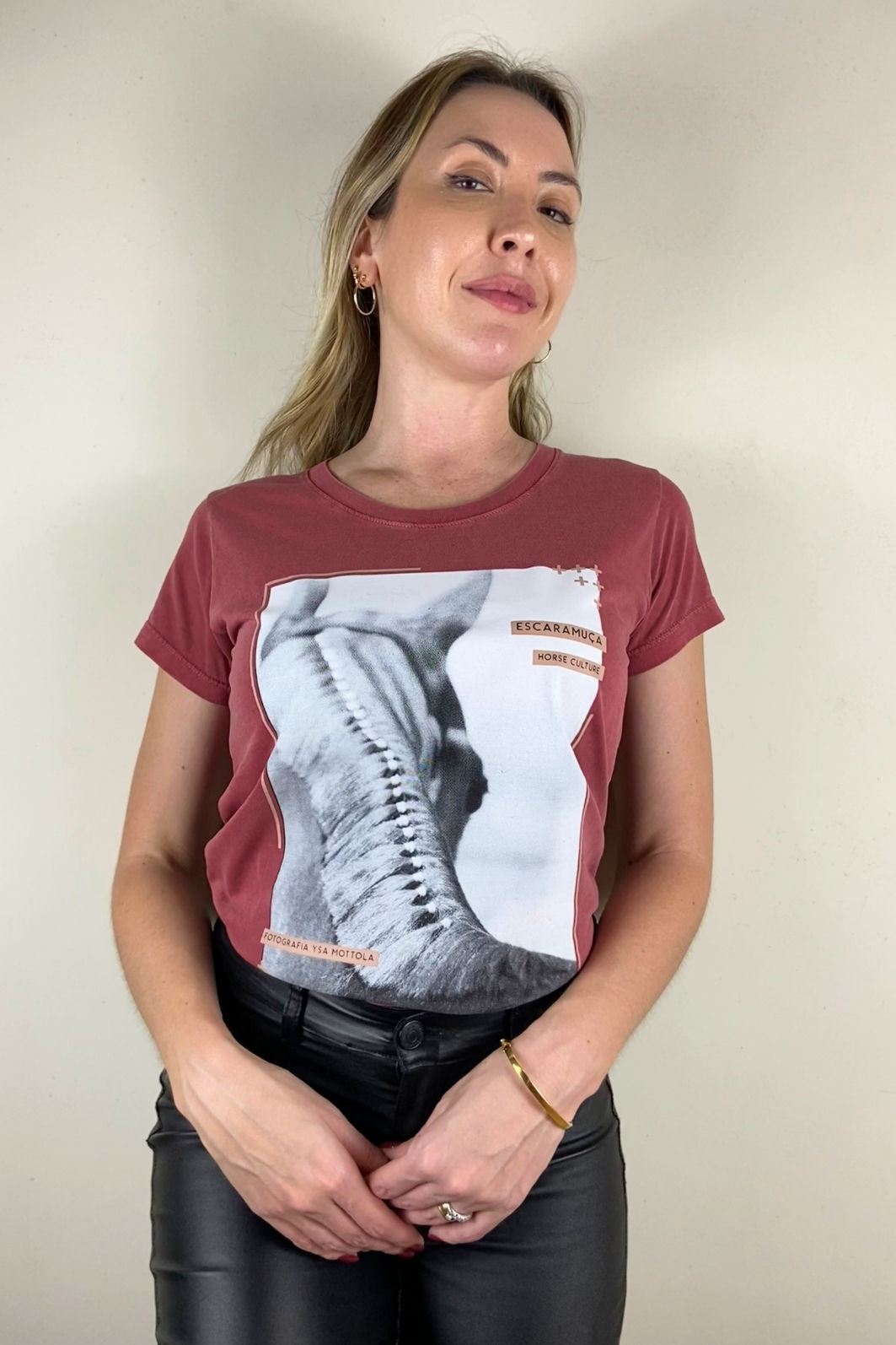 T-shirt feminina em malha 100% algodão premium, lavada e tingida na cor vinho