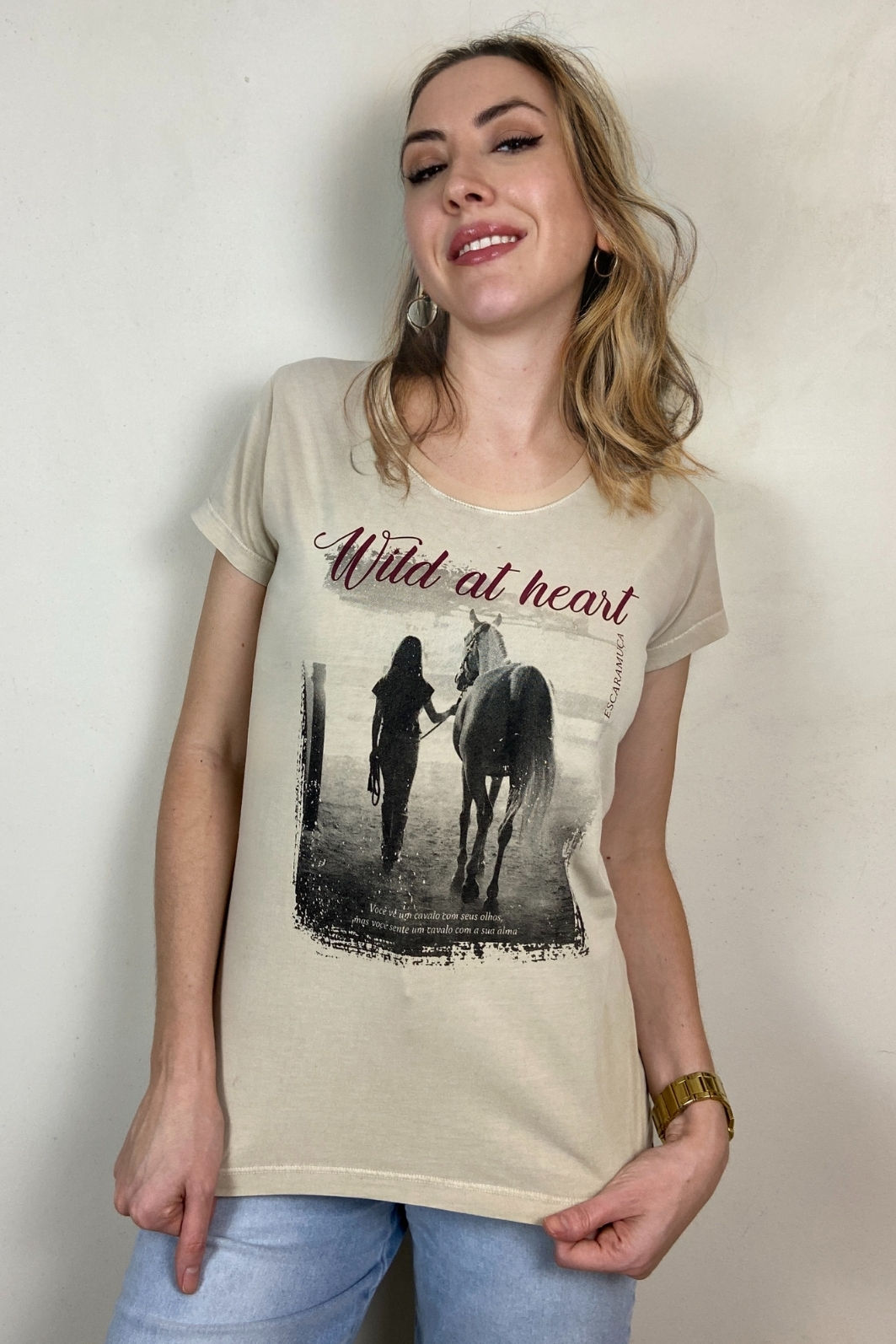 Liberdade, cumplicidade e verdade. A camiseta Wild at Heart traduz em imagem aquilo que toda escaramuçadora sente: a conexão profunda entre uma mulher e seu cavalo. Em tom caqui e com uma estampa que emociona, essa peça é um lembrete de que viver com o coração selvagem é escolher o amor mais puro que existe.